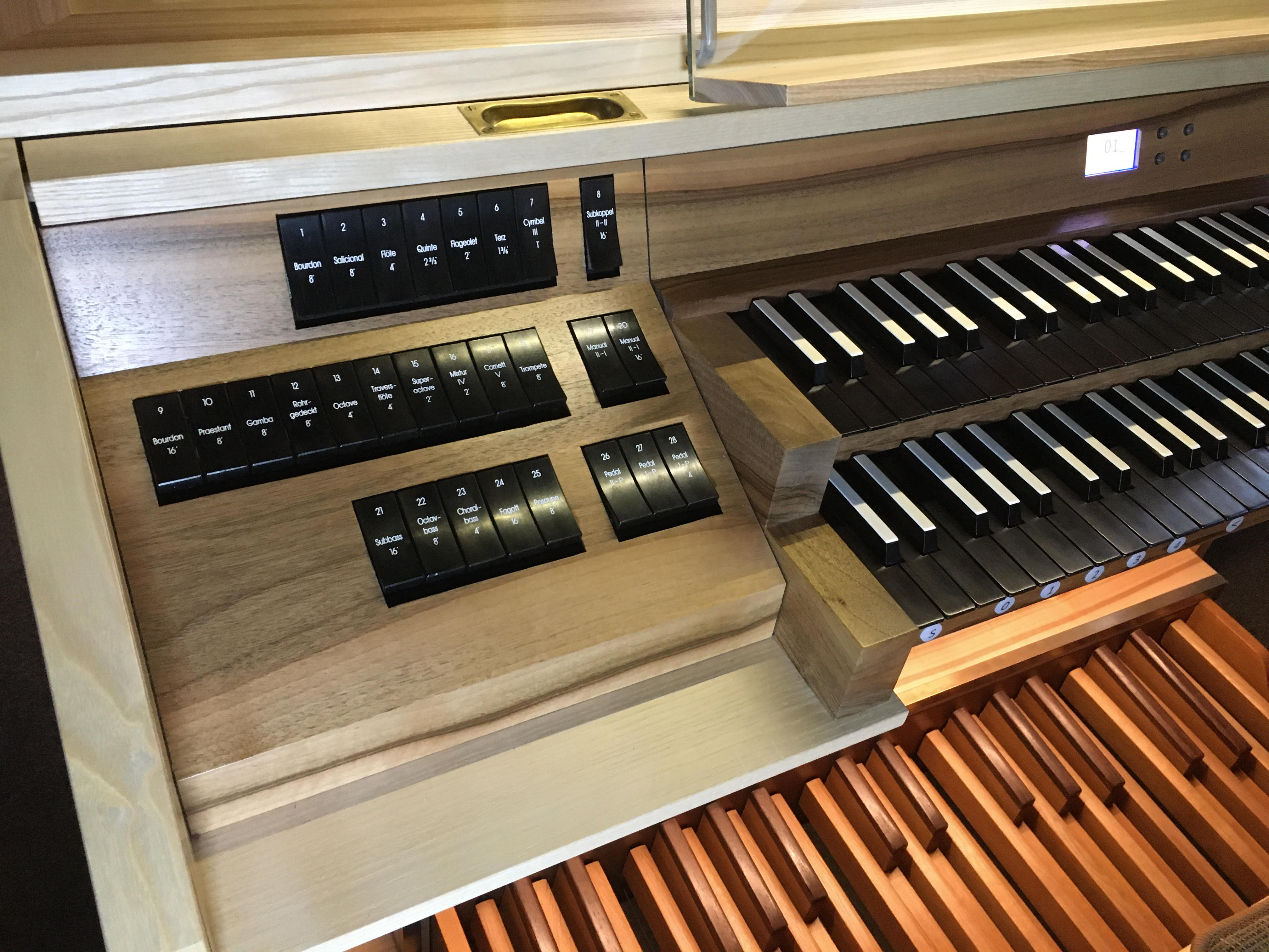 Für das zeitgemäße Spieltischkonzept und Design bedanken wir uns insbesondere für die konstruktive Zusammenarbeit mit Sachverständigen und Organisten. Die überarbeitete Konstruktion der Wippschalter die von Setzern belegt werden können ist in der Umsetzung hervorragend gelungen und ein wahres Spielvergnügen. |